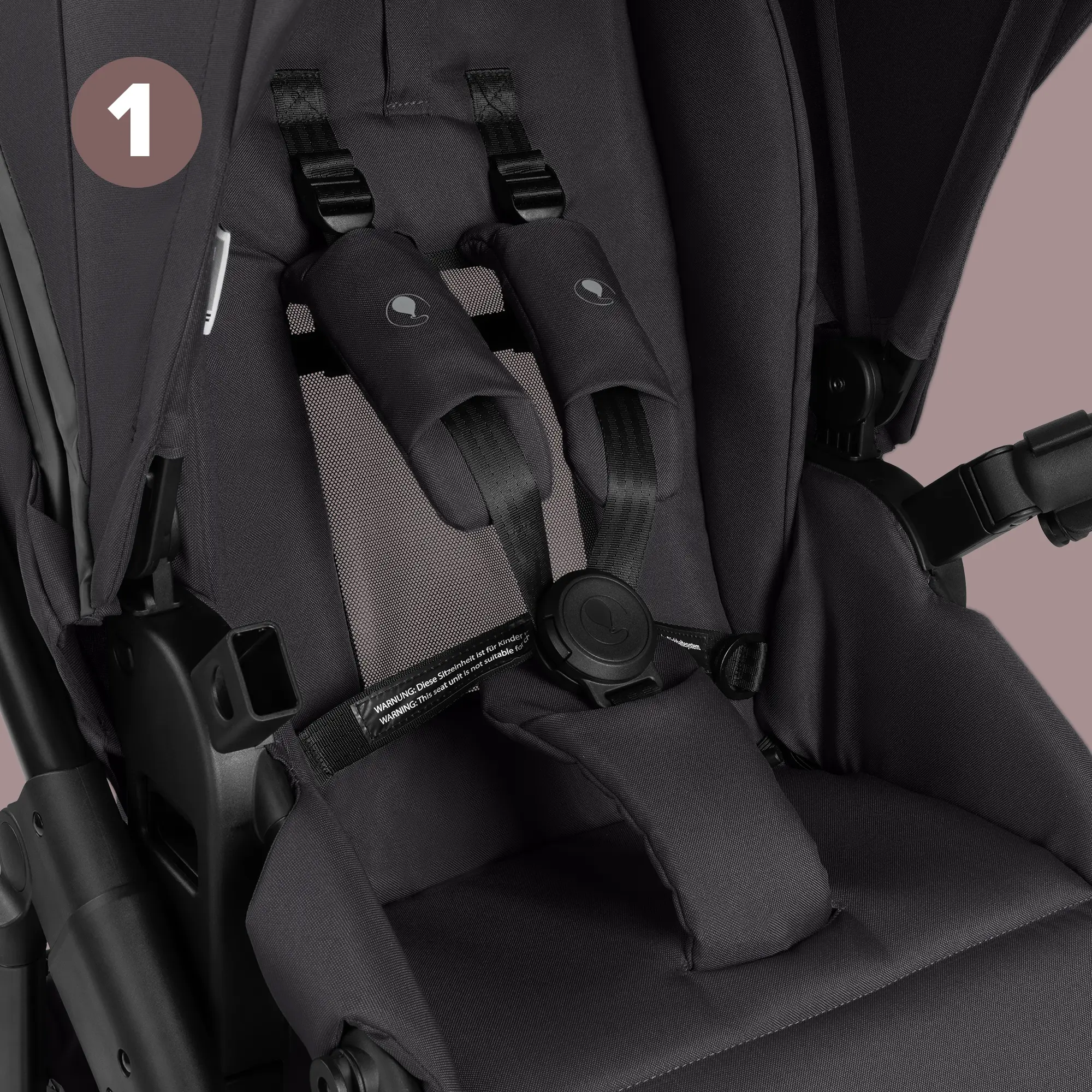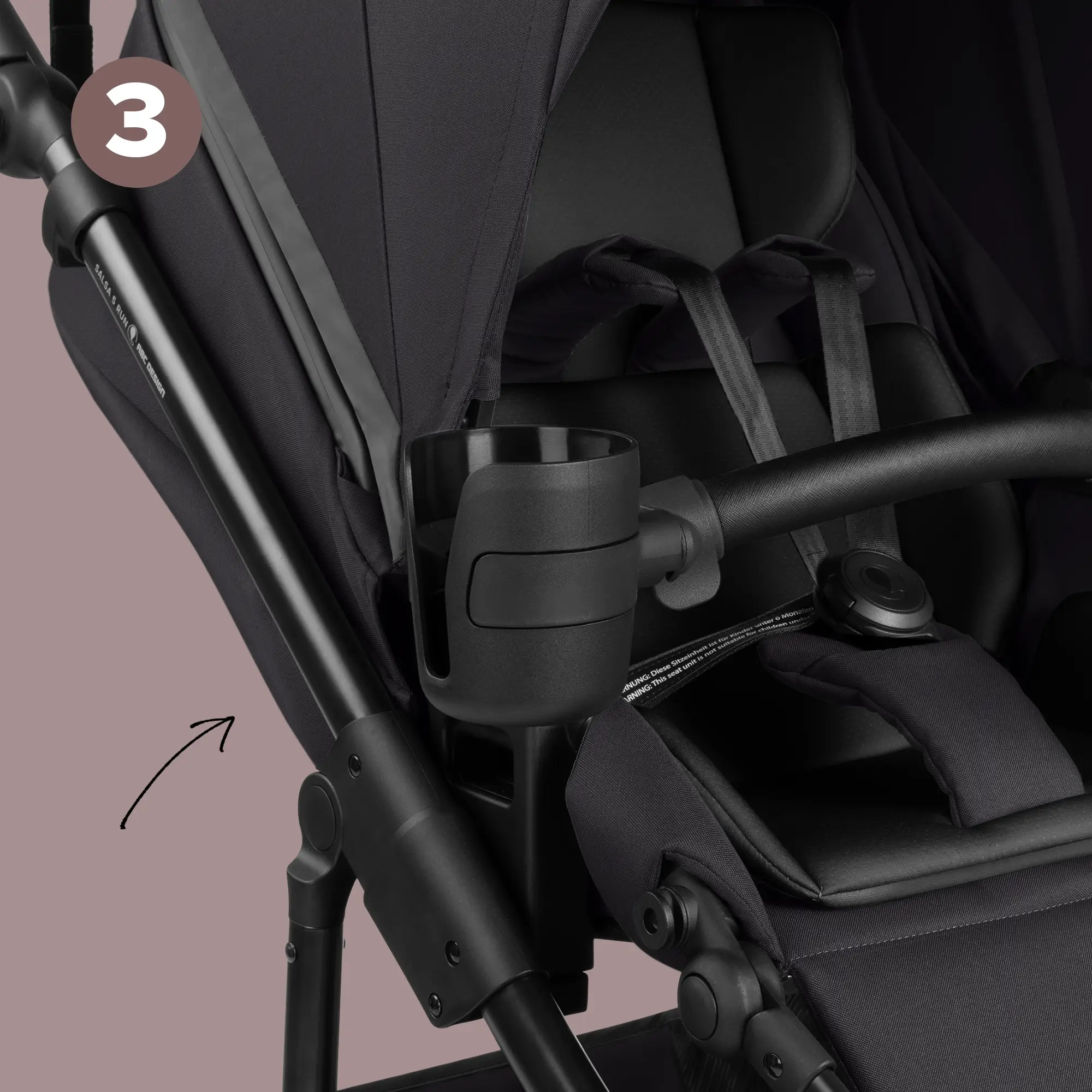 Quando hai il bambino in braccio, ora puoi comodamente ribaltare all'indietro la capottina della nuova navicella con l'altra mano. A tal fine, basta premere brevemente il pulsante su ciascun lato per sbloccare la regolazione della capottina. Nel modello precedente era necessario premere contemporaneamente entrambi i pulsanti di sblocco, cosa impossibile con una sola mano. Apprezzerai questo comfort in più nella vita di tutti i giorni.