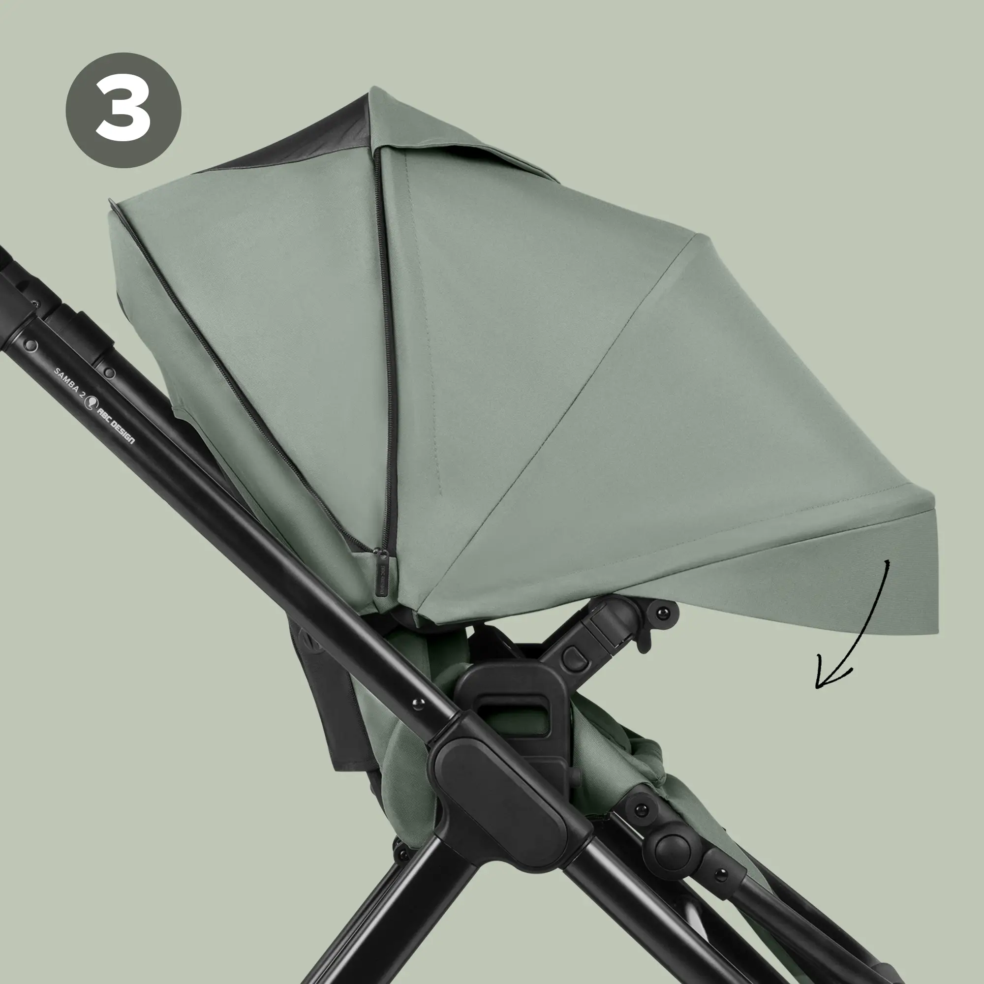 Con Samba 2 potrai beneficiare di una capottina parasole allungata del seggiolino sportivo. Non solo potrai aprire la capottina, ma avrai anche una visiera parasole aggiuntiva nella parte anteriore. Se necessario, potrai aprirla o chiuderla. Soprattutto in condizioni di luce estreme, come ad esempio il sole basso della sera, questo offre un notevole valore aggiunto per te e il tuo bambino.
